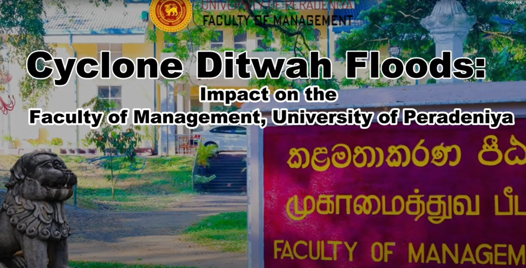 The recent Ditwah Cyclone and the subsequent flooding of the Mahaweli River caused severe damage to the Faculty of Management, University of Peradeniya, significantly affecting our infrastructure and academic facilities, resulting in estimated losses of approximately LKR 265 million, excluding the value of buildings. Despite this setback, the Faculty of Management remainscommitted to resilience, recovery, and continuity in academic activities. We sincerely appreciate the support, cooperation, and solidarity shown by all stakeholders during this difficult time. Together, we move forward with strength and determination.