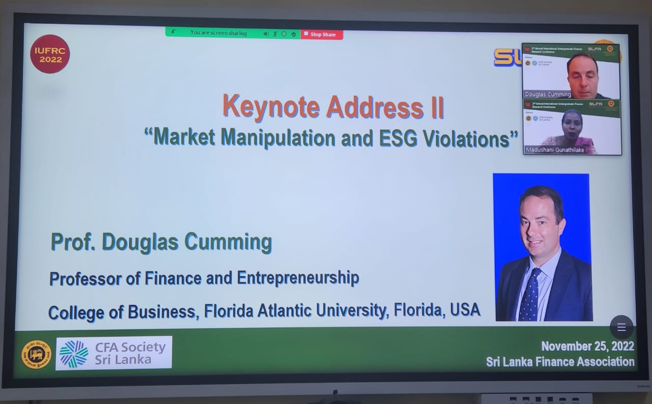 Prof. Douglas Cumming, Professor of Finance and Entrepreneurship, College of Business, Florida Atlantic University, Florida, USA delivered a quality keynote speech on “Market Manipulation and ESG Violations” describing how market manipulation enables corporate deception, which in turn facilitates ESG manipulation. Further, Mr. Nishan Fernando, Chairman, of First Capital Holdings PLC, and the Managing Director of BDO Consulting delivered a keynote speech titled “Sustainable Finance- Risk to Opportunity” while concentrating on the elements of sustainable finance and the sustainability challenges to society. The session concluded by providing a deep idea about how finance contributes to sustainable development in a society.