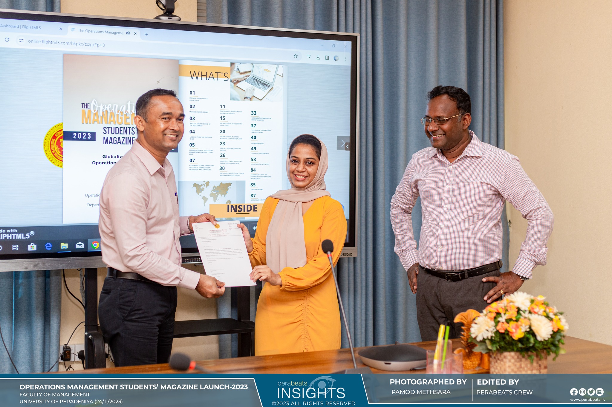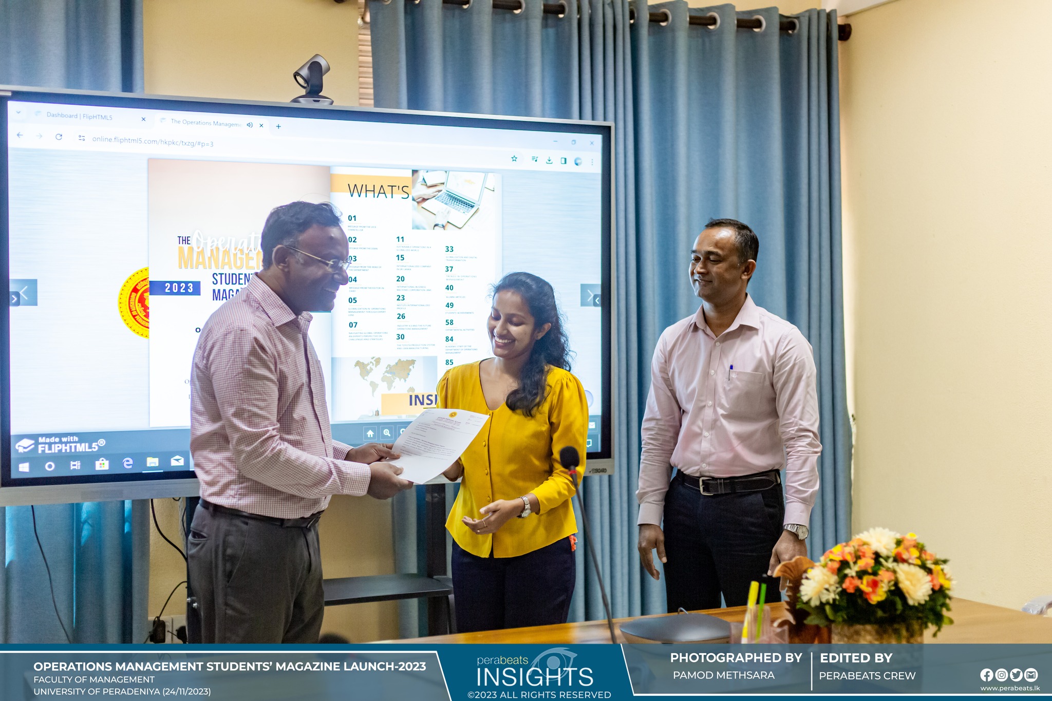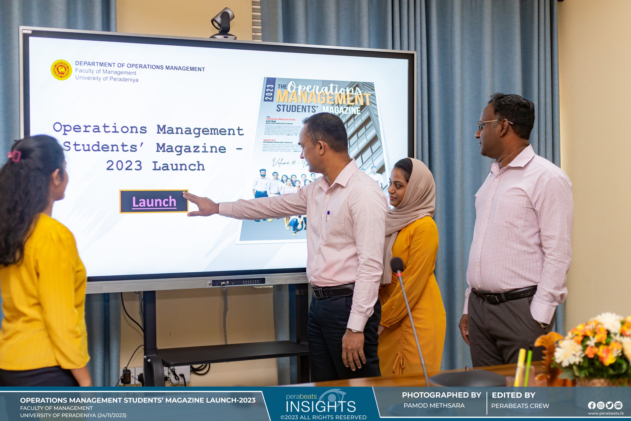 The Operations Management Students’ Society launched the second issue of “The Operations Management Students’ Magazine” the bi-annual students’ e-magazine on the 24th of November, 2023 at the Innovation and Co-Creation Cell, Faculty of Management. The event was graced by Prof. Ravi Kuruppuge, Dean, Faculty of Management as the chief guest, followed by all heads of departments. Ms. Reema Zulfiqar, the Editor-in-Chief and Ms Sujani Dissanayake, the Managing Editor of “The Operations Management Students’ Magazine” officially launched the E-Magazine in the presence of Prof Ravi Kuruppuge, Dean, Faculty of Management, University of Peradeniya and Dr S. Maheshwaran, Head, Department of Operations Management, Faculty of Management, University of Peradeniya.