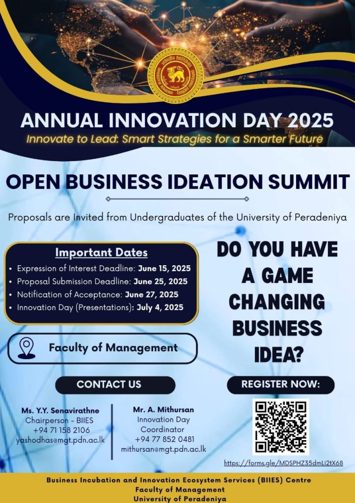 Have a game-changing business idea? Seize this opportunity to showcase your innovation and strategic thinking at the Open Business Ideation Summit, organized by the BIIES Centre, Faculty of Management, University of Peradeniya. The Faculty of Management, University of Peradeniya, invites all undergraduates of the University of Peradeniya to submit proposals for the Open Business Ideation […]